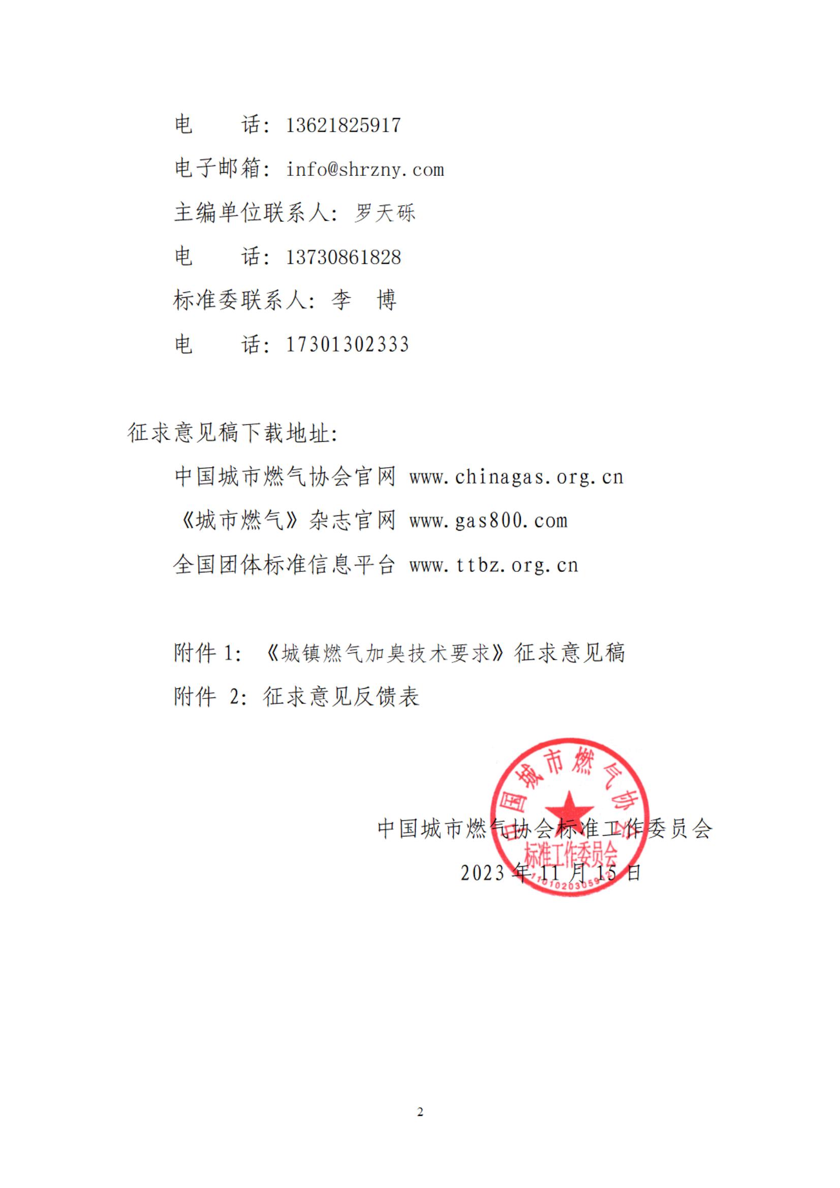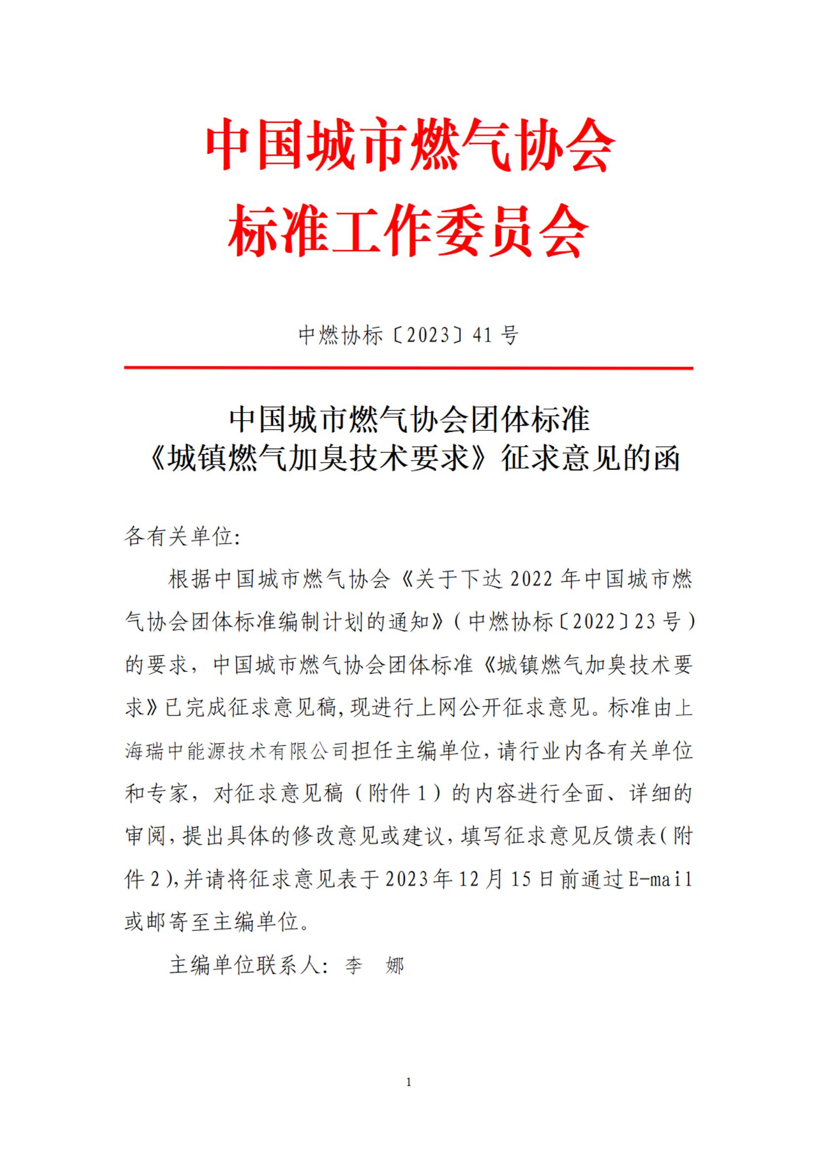 中燃协标〔2023] 41 号 中国城市燃气协会标准工作委员会关于对团体标准《城镇燃气加臭技术要求》征求意见的函